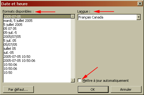 N.B. - L'option Mettre à jour automatiquement met à jour la date du document