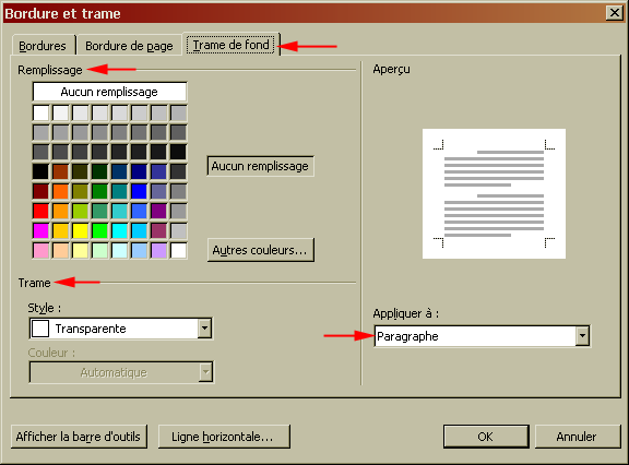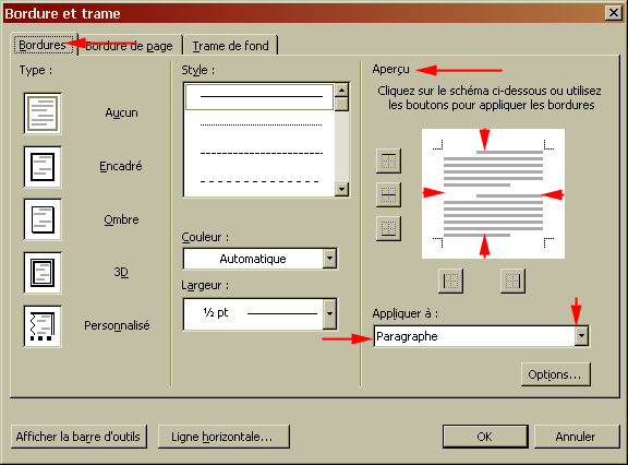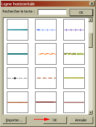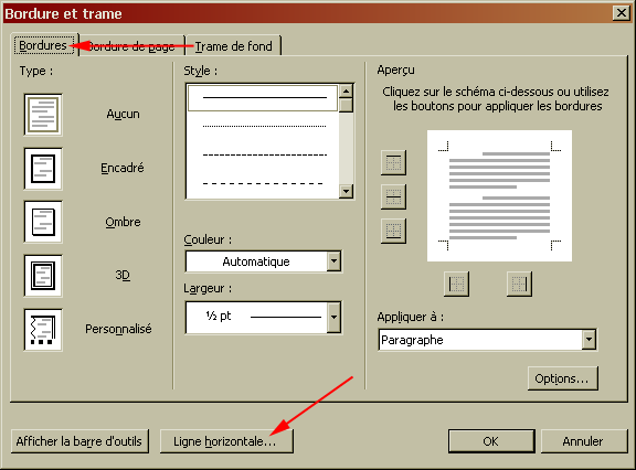 - Cliquer sur le bouton: Ligne horizontale... (en bas à gauche de la boite de dialogue).