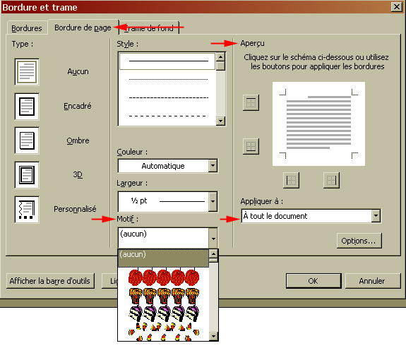 - Appliquer à: À tout le document ou Cette section ou Uniquement la 1ère p. ou Tous sauf la 1ère p.